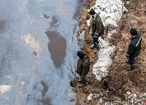 Нефтяной камуфляж на реке Ухта в поселке Шудаяг. Съездили посмотреть, как разлилась нефть. Как мы поняли, проводятся подготовительные работы перед установкой бонов. Выясняем.